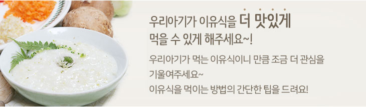 이유식은 아기가 처음으로 먹는 음식입니다. 그 경험을 바탕으로 맛에 대한 기억이 형성되지요. 그래서 더더욱 중요한 시기랍니다.