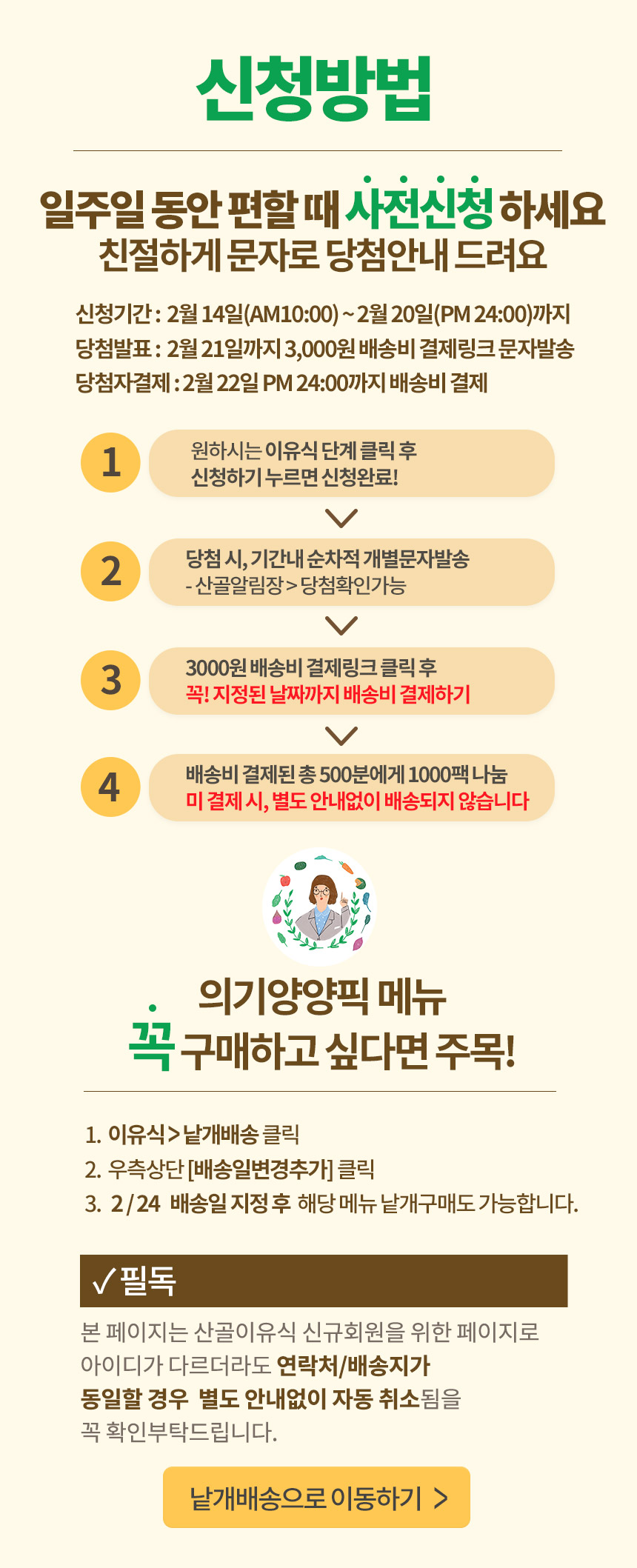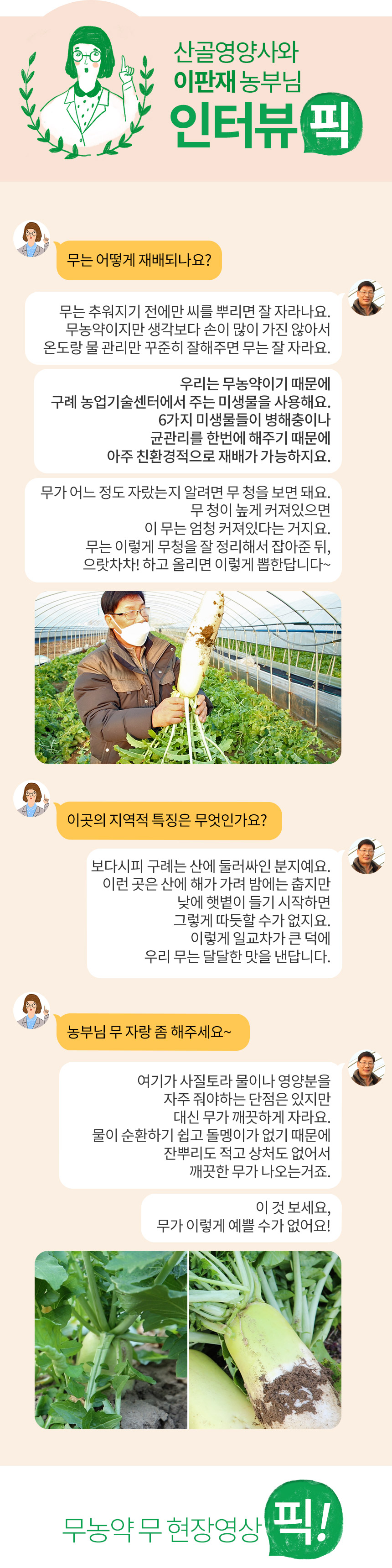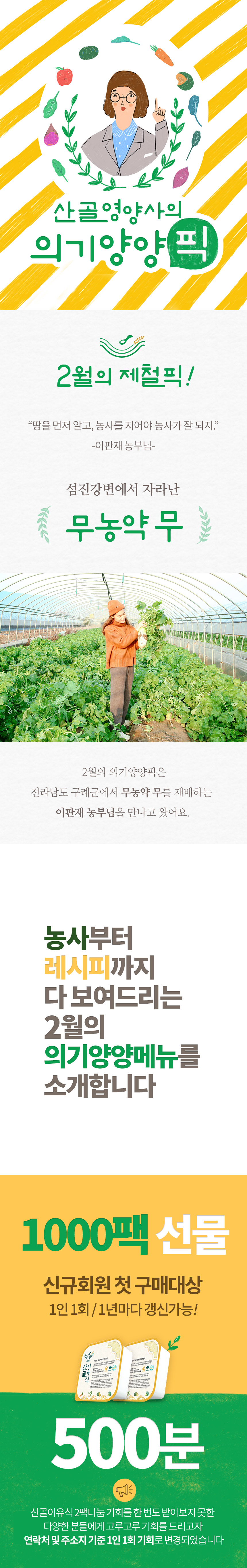 무농약 무 의기양양픽 1000팩 완판되었습니다 3월의 청경채로 돌아오겠습니다! 기대해주세요! 의기양양픽은 앞으로도 계속 1주일 동안 사전신청제로 운영됩니다